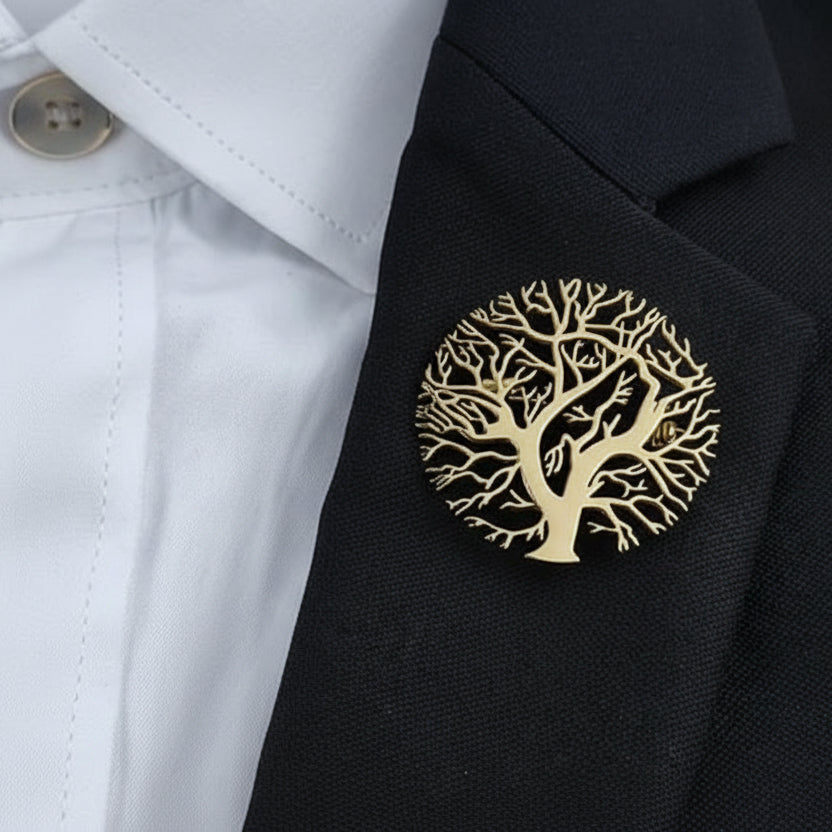 Premium Tree of Life lapel pin in 18K gold plated stainless steel. Elegant brooch for suits, weddings & special occasions. Perfect gift for men. Shop now!